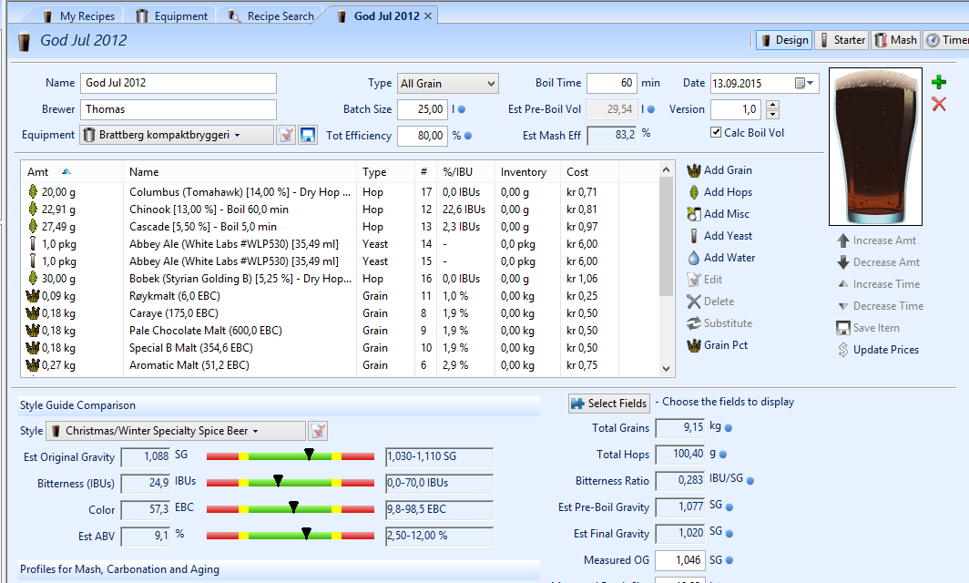 Jeg kjøpte meg også en lisens på BeerSmith 2 for å hjelpe meg med å lage oppskriften og skalere etter utstyret mitt (fant en template på min Brattberg). Gleder meg til å leke meg mer i dette programmet senere og lære litt mer om egen-komponering av oppskrifter og få lagret all informasjon der.